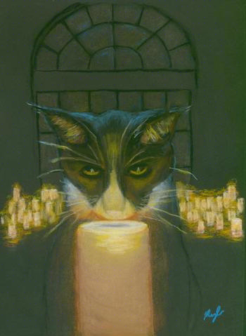 Pinkerton (Pinky) has been a frequent model for my work, and I just couldn't help building off of a photo I have of him staring down at something mysterious. A candle seemed the perfect...excuse me, purrfect...subject for his interest. The result reminds me of the cover of a classic young adult mystery novel such as Nancy Drew or the Hardy Boys - thus the name.