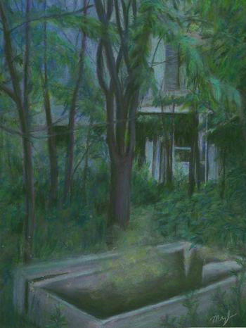 This was once a lovely home, but once abandoned, nature quickly took it back into her embrace. I couldn't help adding a little touch of something more macabre, complete with a mysterious green miasma floating above the sarcophagus.