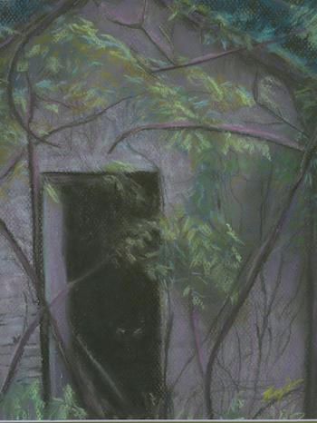Soft purple and green pastels pick out the lines of an old, abandoned smokehouse...and the mysterious eyes peering from within. Is it a wolf, perhaps? Or something more...supernatural? I've never quite decided myself, though I do lean a certain way.