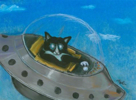 Once again featuring Pinkerton (Pinky), but this time in a comic style. Cats twist themselves into all kinds of funny poses, and with his reflective eyes and his paw out as if to control something, I couldn't help but picture him flying his own little space ship. You might want to stay out of his way!