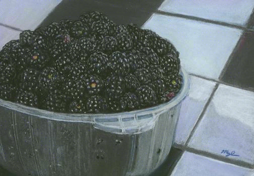 Despite my squirrel friend's interest in my blackberry bushes, I did manage to havest some for myself - quite a bountiful one, in fact. I've paid tribute to my bounty with this still life. I loved finding the subtle variations in value that allow you to 'see through' the bowl to the berries inside, giving the viewer a hint of their juiciness.