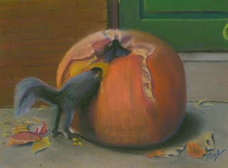 It didn't take me long to realize that using untreated gourds and squash as fall decorations outside was very appreciated by the local fauna. But this moment made me laugh myself silly. I've taken to referring to this little guy as 'Ichabod' - because he's lost his head to a pumpkin.